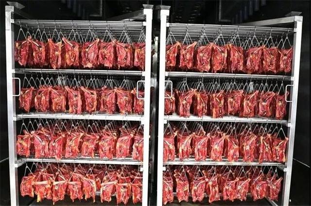 腌制完成的雞腿被整齊懸掛在全自動烘干間內(nèi),歷經(jīng)17-32小時,9個不同階段不同溫度的高溫烘干。在保持干燥和半小時排風(fēng)一次的情況下,脫水烘干好的雞腿在烘干間內(nèi)靜置4-6小時自然冷卻,整道工序才算完整。