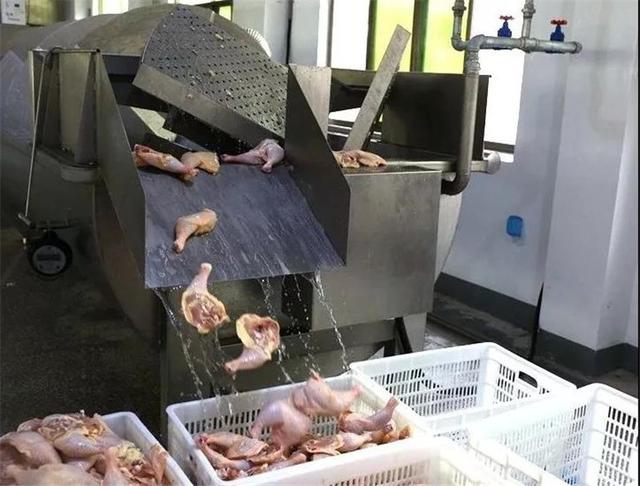 每一批用于生產(chǎn)的雞腿原料都需放在盛滿清水的不銹鋼桶中通過不停滾動來進行解凍,這個過程約半小時至一小時,主要為保證雞腿完全清洗干凈、沒有血污與雜質(zhì)。
