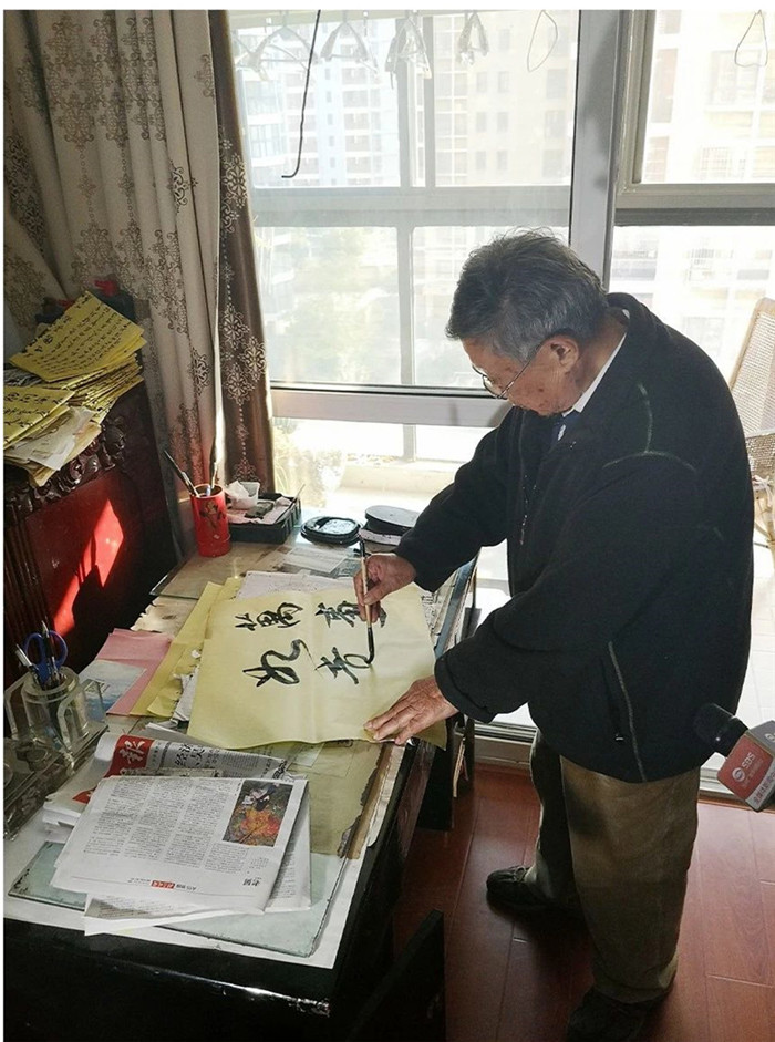 每天會去康復中心看看老伴,送去自己親手煮的飯菜。其余閑暇時間,全都是花在了書法傳承這件事情上。他經常會把自己寫的書法作品送給日間照料中心、送給社區;還會在寒暑假給轄區居民送對聯;給青少年上書法課。