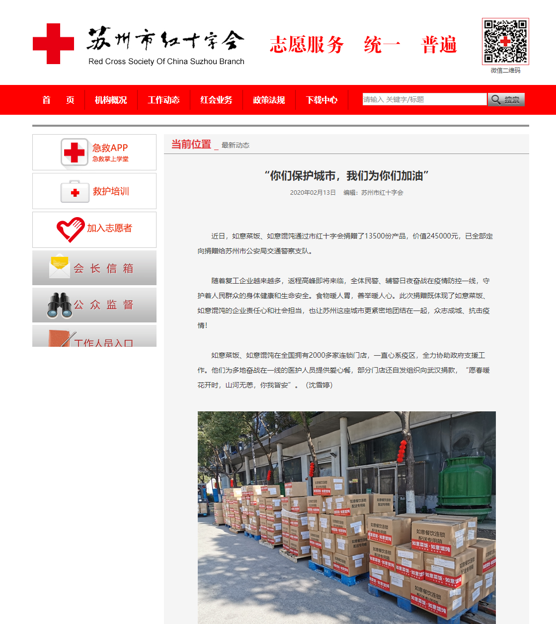 蘇州紅十字會(huì)報(bào)道:“你們保護(hù)城市,我們?yōu)槟銈兗佑汀?/h1>