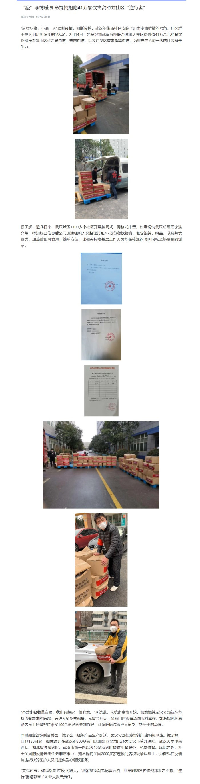 文章來源:騰訊大楚網,“疫”寒情暖 如意餛飩捐贈41萬餐飲物資助力社區“逆行者”