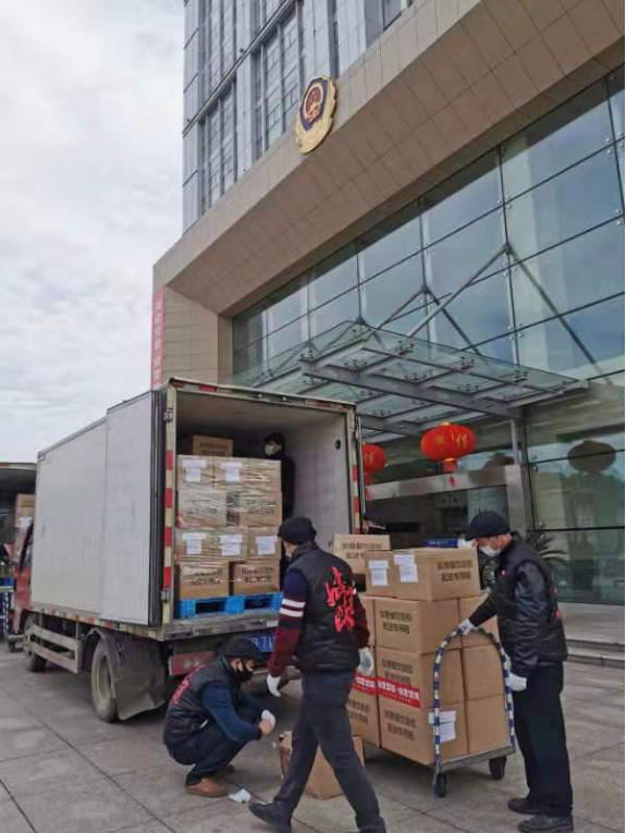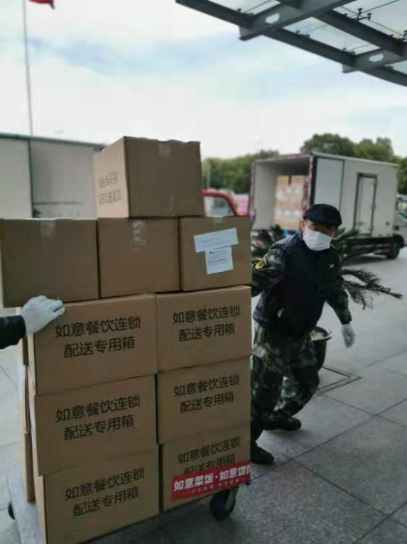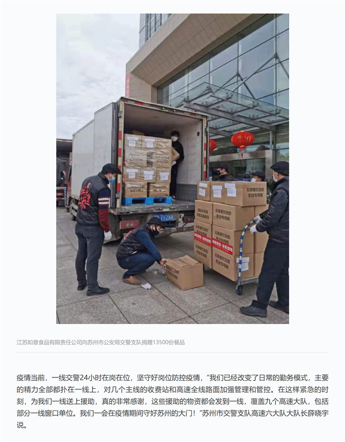 2月10日中午,總部坐落在蘇州高新區滸墅關鎮的企業——江蘇如意食品有限責任公司內繁忙一片,工作人員正忙著將260多只紙箱打包裝入廂式貨車。下午1時,兩輛廂式貨車駛入蘇州市公安局交警支隊,6名工作人員將紙箱搬下車,箱子上不僅貼著打包員的姓名、體溫、洗手消毒情況,還貼著梅干菜扣肉、醬汁排骨、骨頭湯等字樣的標簽。這是該企業在正式開工首日向蘇州市公安局交警支隊捐贈的13500份餐品,總價值245000元。