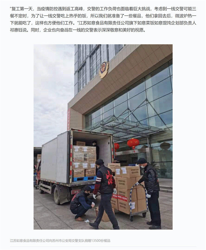 “復工第一天,當疫情防控遇到返工高峰,交警的工作負荷也面臨著巨大挑戰,考慮到一線交警可能三餐不定時,為了讓一線交警吃上熱乎的飯,所以我們就準備了一些餐品,他們拿回去后,微波爐熱一下就能吃了,這樣也方便他們工作。”江蘇如意食品有限責任公司旗下如意菜飯如意餛飩企劃部負責人祁惠鈺說。同時,企業也向奮戰在一線的交警表示深深敬意和美好的祝愿。