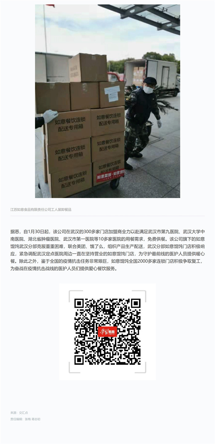 據悉,自1月30日起,該公司在武漢的300多家門店加盟商全力以赴滿足武漢市第九醫院、武漢大學中南醫院、湖北省腫瘤醫院、武漢市第一醫院等10多家醫院的用餐需求,免費供餐。該公司旗下的如意餛飩武漢分部克服重重困難,聯合美團、餓了么,組織產品生產配送,武漢分部如意餛飩門店積極響應,緊急調配武漢定點醫院周邊一直在堅持營業的如意餛飩門店,為守護最前線的醫護人員提供暖心餐。除此之外,鑒于全國的疫情抗擊任務非常艱巨,如意餛飩全國2000多家連鎖門店積極爭取復工,為奮戰在疫情抗擊戰線的醫護人員們提供愛心餐飲服務。