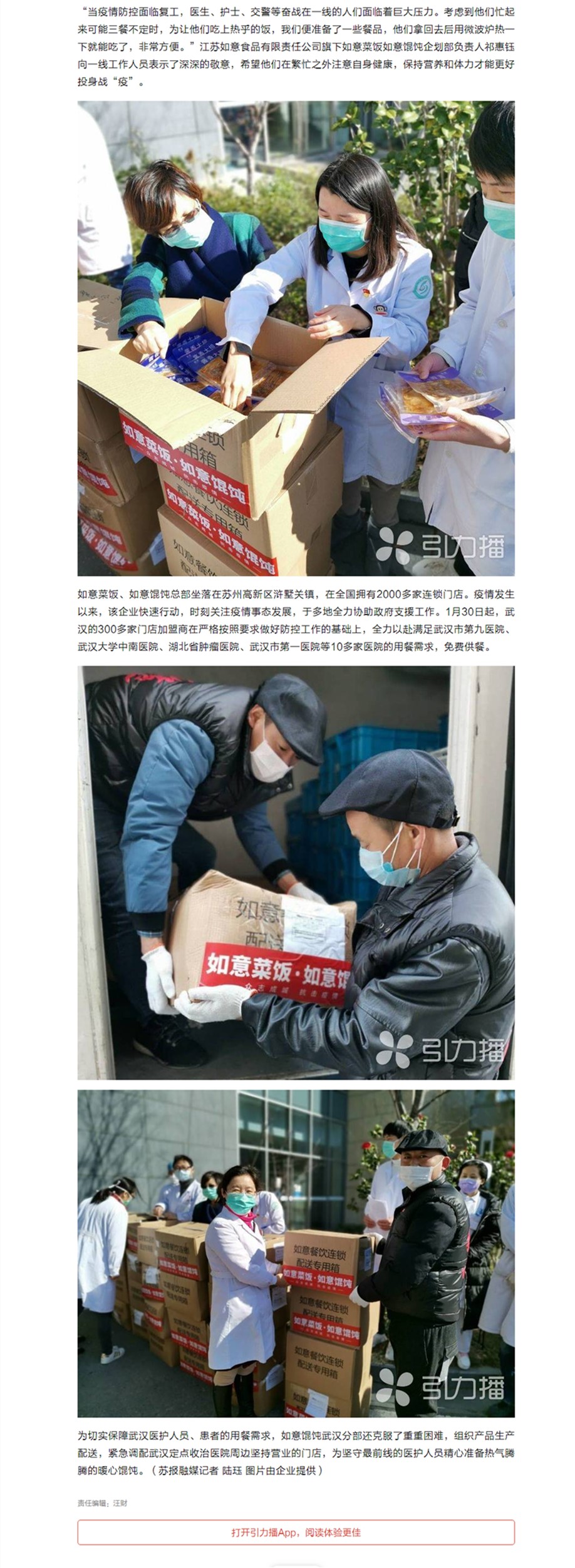 為切實保障武漢醫護人員、患者的用餐需求,如意餛飩武漢分部還克服了重重困難,組織產品生產配送,緊急調配武漢定點收治醫院周邊堅持營業的門店,為堅守最前線的醫護人員精心準備熱氣騰騰的暖心餛飩。(蘇報融媒記者 陸玨 圖片由企業提供)