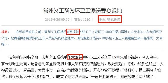 現代快報報道:常州義工聯為環衛工派送愛心餛飩