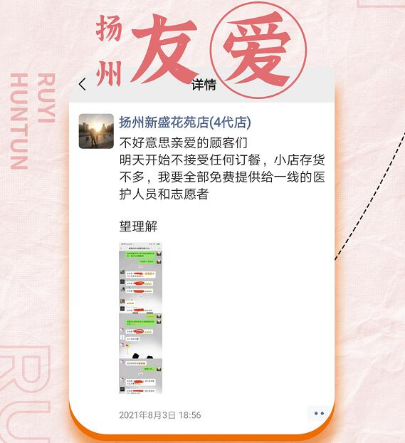 面對全面封城,所有揚州的如意人第一時間配合關鋪,而且主動加入社區的志愿群,連外賣也不接單了,把所有存貨留給抗疫一線的醫護人員