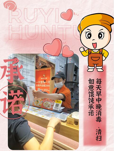 如意餛飩承諾,每天早中晚消毒、清掃,針對堂食顧客,進店查看行程碼、測溫并登記