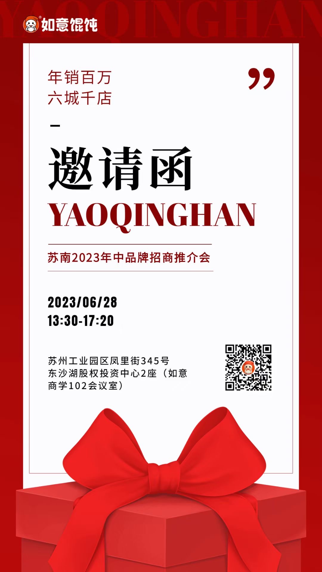 就像如意®餛飩,最近6月28日就有一場線下【年中招商推介會】,誠邀各位意向客戶來到現場考察,感興趣的朋友可以掃碼下方二維碼咨詢報名,也可以直接電話聯系400-0512-597