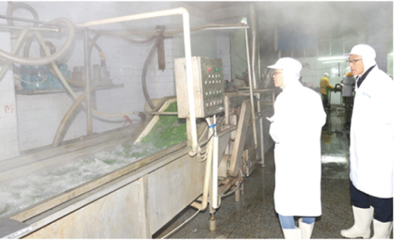 如意的供應商質量管理員檢查了傳送帶上的薺菜是否符合要求和清洗池內水的清潔程度,還觀察了挑揀工人的操作。