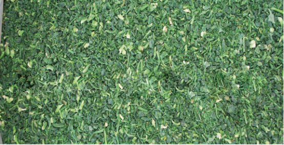 切好段的薺菜會在-35℃的車間進行二次分切,變成更小一些的薺菜末,也就是我們薺菜餛飩的主要食材。二次分切后的薺菜末落入分切口底部的震動過篩處。